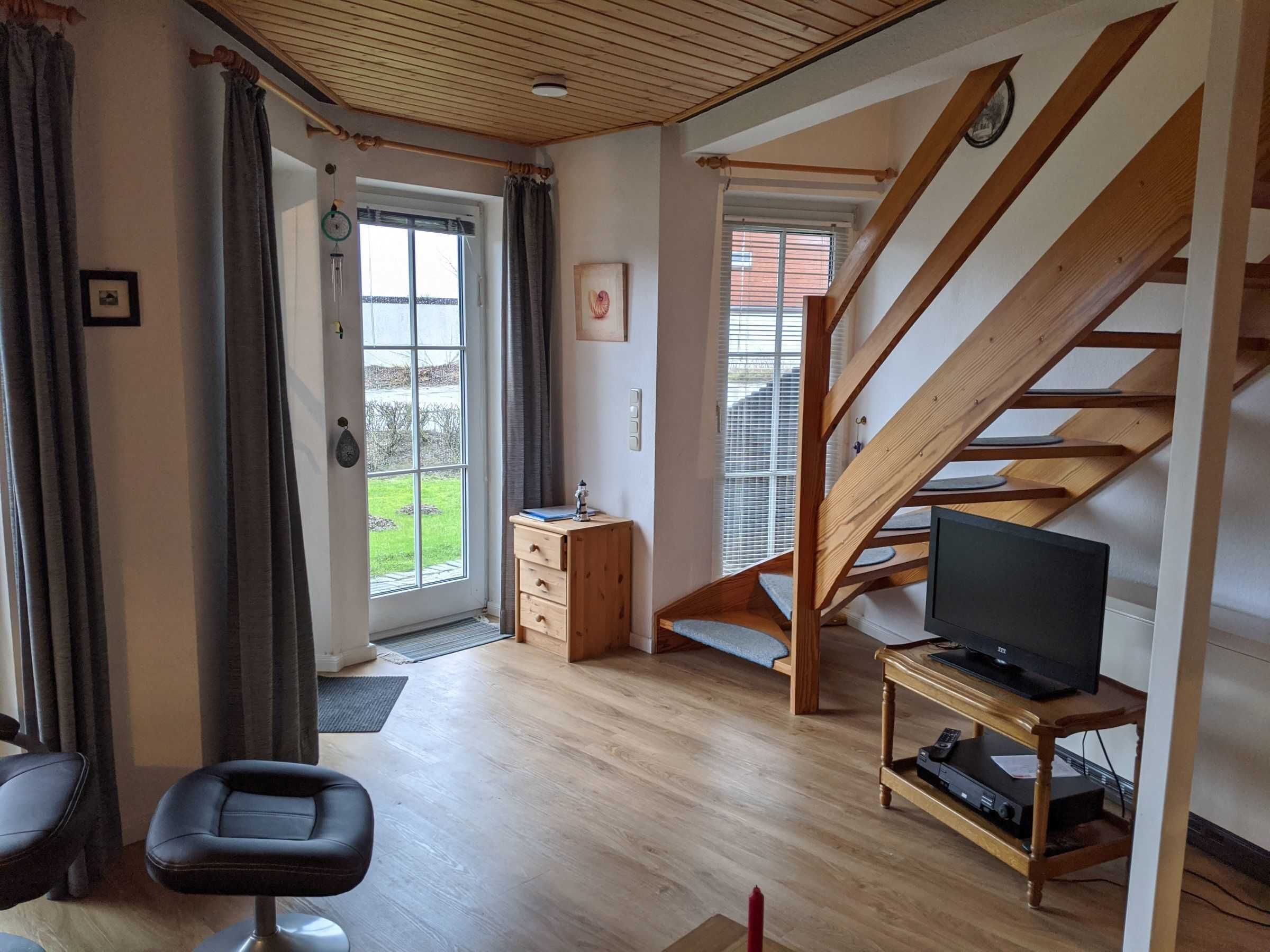 • Semi-detached house, size approx. 60 sqm, ground floor and 1. Floor (attic) • 1 living room with fitted kitchen unit (with dishwasher, oven, etc. • 1 bedroom with 2 separate beds (attic) • 1 bedroom with double bed (ground floor) • Shower / WC (ground floor) • Sunbathing area, terrace, garden furniture, satellite TV, radio, WLAN, child-friendly equipment with cot, high chair, children's toilet seat, staircase downstairs etc., central heating, parking space. • Please bring bed linen and towels, but can also be rented from the landlord for a fee • Pets are not allowed • The living area is tiled and the bedrooms have laminate flooring • Washing machine can be shared with the Zintl family (next door).