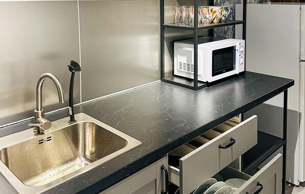 Look forward to the cosy furnishings in the living area with traditional upholstered furniture. The seating area is generously proportioned and is ideal for relaxing evenings. Use the adjoining dining area with its classic wooden table for shared meals or quiet games. Prepare your meals in the compact kitchenette. The open-plan design makes for pleasant socialising.