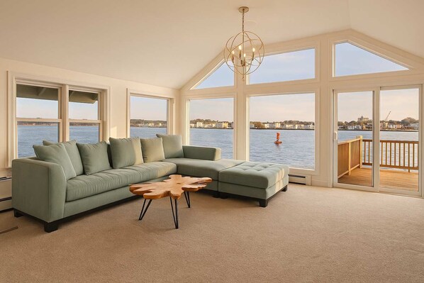 → Dining room with oversized windows framing spectacular water views