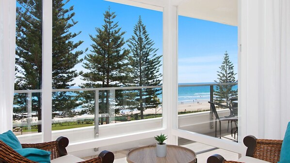 Beachfront 3rd Floor apartment, balcony with stunning views over Rainbow Bay and Snapper Rocks. Renovated 2 bedroom apartment with 1 king bed and 2 single beds. Reading nook to sit with your morning coffee and watch the sunrise over snapper rocks. The building has a swimming pool and a lift. single lock up garage. Everything you need for a relaxing holiday.