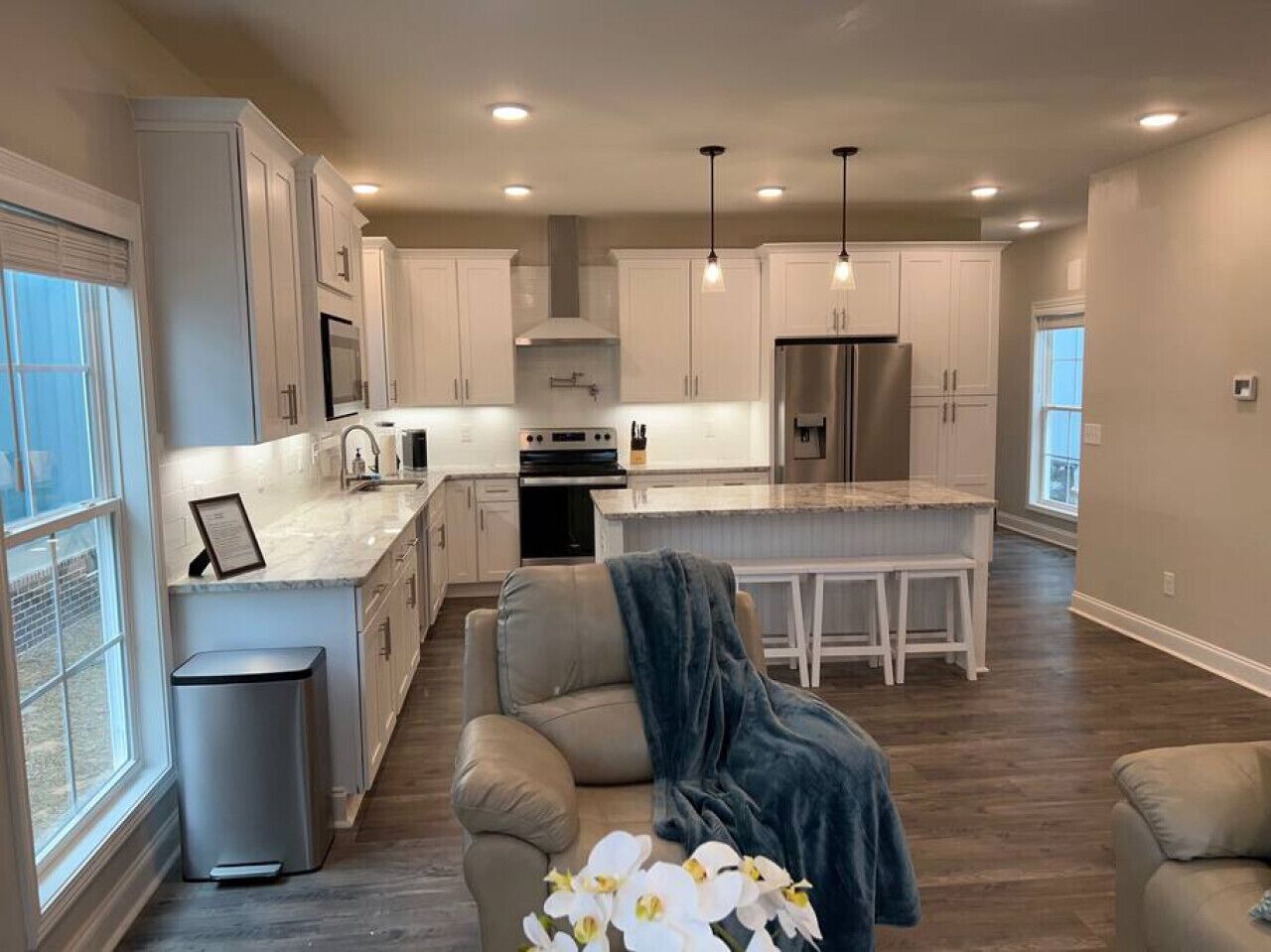 Inside, soaring ceilings, crown molding, and wood floors create an elegant but welcoming atmosphere. The home features five bedrooms and 3.5 baths, comfortably sleeping 8 adults plus children, with the privacy and comfort of four master-level sleeping spaces. All beds are outfitted with brand-new luxury linens, allergy-friendly pillows (no down), ceiling fans in every bedroom, and extra side fans to ensure restful sleep after long days at the course.
