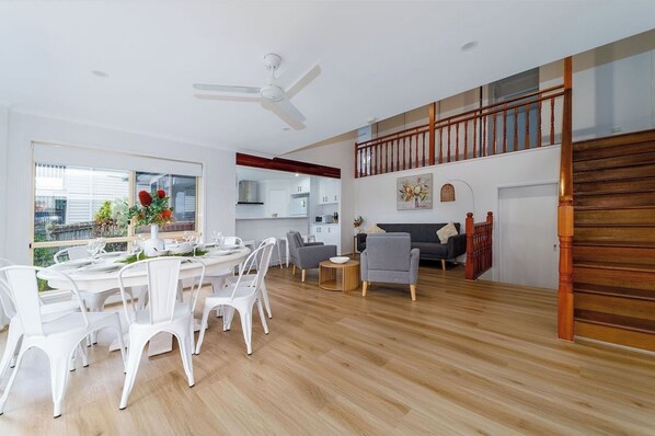 Two separate lounge areas, a dedicated sitting area, and a bright dining space set up for shared meals.