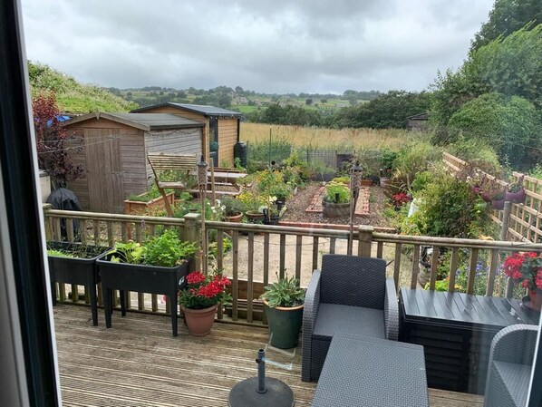 A single back door and double French doors open out on to a decking area which has seating. A washing line is present for drying your clothes and the beauty of the rear garden is its unblocked view out on to an open field backdrop and views across the valley.