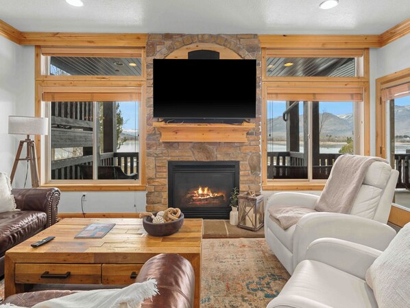 The main level has an open concept kitchen and living room. Comfortable couches, gas fireplace, Streaming TV plus Amazon Fire stick, large windows, deck access, dining room table, barstool seating. The fully stocked kitchen has cookware, dishes, spices, and stainless steel appliances. The upstairs outdoor deck includes outdoor furniture, BBQ grill, and a covered porch.