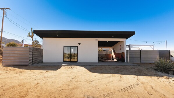 Escape to the desert in style at The Sunrise Haus, a newly constructed tiny home near Joshua Tree National Park. Unwind in the fully fenced-in yard with a fire pit and pergola or enjoy starry nights from hanging hammock chairs.