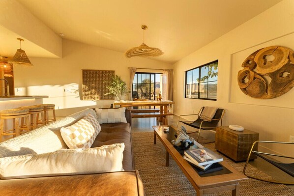 A fully equipped kitchen with sleek microcement counters, artisanal fixtures, and modern appliances, designed to inspire your culinary creativity. The open dining area invites you to savor meals while enjoying natural light and serene desert views.