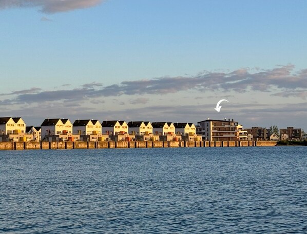 Admiralslounge- EG, Infrarotsauna, Grosse Dusche, Terrasse, Blick auf das Hafenbecken