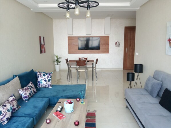 Appartement fabuleux en plein centre ville avec vue magnifique sur l'ensemble de la ville, neuf, avec des équipements toutes neuve,connexion WIFI, chaîne câble, IPTV, NETFELEX, proche de touts les restaurants/bar/ d night club, loin de la gars 3 minute à pied, très facile et prouche de l'accès autoroute : Rabat/ Tanger/Fes, un super marché juste enface, pas de vis à vis avec les voisins, la résidence calme et dispose de 2 ascenseurs, une place au garage avec accès par télécommande