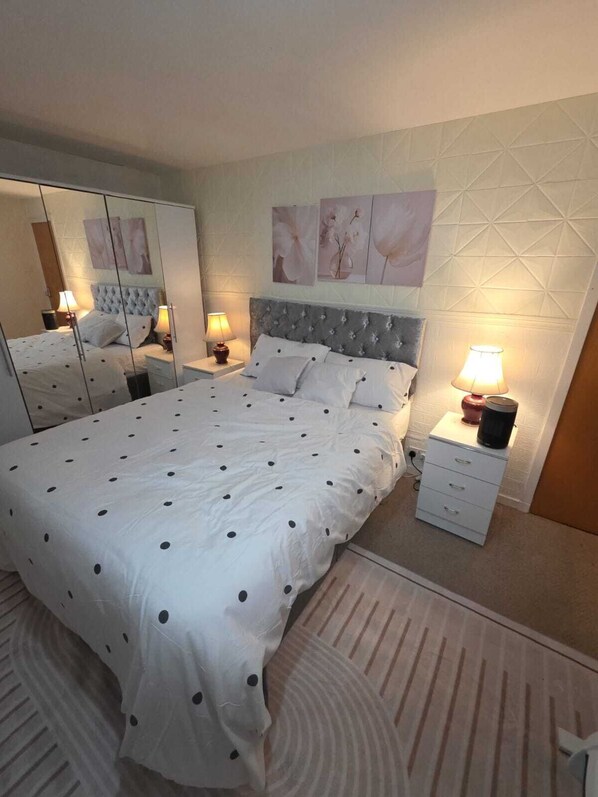 A beautifully presented bedroom with a double-size bed, high-quality mattress, duvet, and pillows. This room also features a wardrobe, bedside lamps, shelving, a reading desk with chair, and a smart heater for heating or cooling. Extra pillows and bed linens are available.