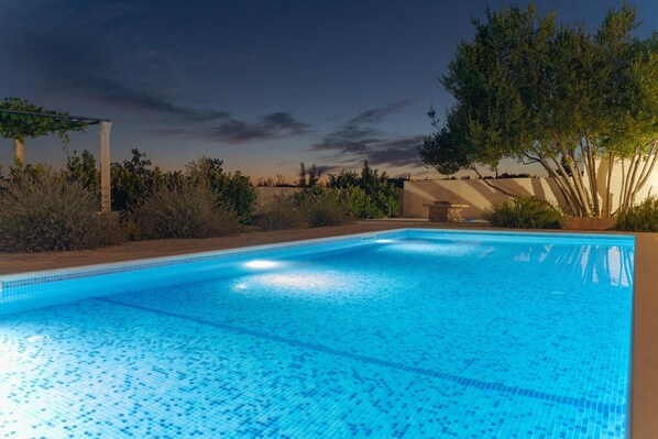 Outdoor space is created to give you total privacy to enjoy in your holiday. There is a big swimming pool with sunbeds and parasols. Near swimming pool there is barbecue, as well as dinning place in natural shade where you can enjoy your meals.