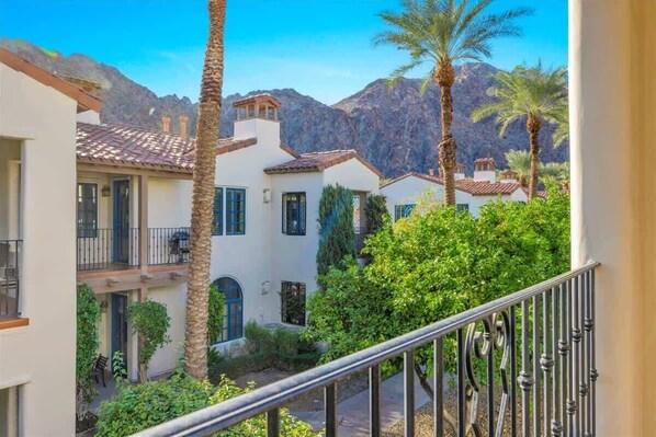 Legacy Villas, a serene oasis in La Quinta, offers an upstairs lock-off studio with a king bed and private patio overlooking the Santa Rosa Mountains. Savor the cozy fireplace and smart TV in your spacious bedroom or enjoy everything Legacy Villas has to offer: 12 saltwater pools, walking paths with sparkling fountains, fitness center, poolside grill on weekends and select weekdays.