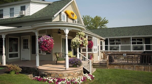 Mike was quick to respond to all my questions and has a GREAT team who looked after our every need. Amber and Dominic who are working at the motel for the Summer, were super sweet and jumped to help us with absolutely everything. The home is older and is connected to the office and living quarters of Amber and Dominic. There are several other motel rooms on the property. It is quiet. The three bedrooms are actually layed out like this- Two queens in a fairly good size room with bathroom, 1 double/full bed in a small room with bathroom and one bedroom with a double/full bed all located upstairs. There is a bathroom on the first level where the living room, dining room and kitchen are. There are lots of outdoor patio/porch areas to sit and socialize, some private and others not private. The air conditioning is window units in each bedroom and in the living room, the kitchen has a floor fan. We could not sleep in a double/full bed, so, Amber arranged a twin to be brought into our small bedroom and we made it work. The living room area has a old smell, we bought a air deodorizer, but, it didn't really help.