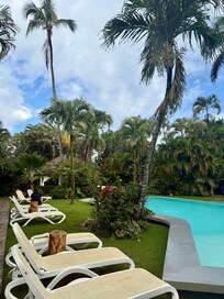 We were very pleased with our stay at Hotel La Tortuga. The service was excellent. We were greeted with a delicious fruit juice. We arrived at the hotel at 2:00 p.m., and they let us check in anyway. We loved the breakfast; you can choose between eggs or pancakes. It includes a fruit cocktail, natural juice, coffee, and bread. There are a wide variety of restaurants and spectacular beaches around Las Terrenas. I recommend Punta Popi Beach... We would definitely stay here again.