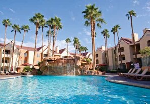 Think of our Desert Club Resort, just a block from world-famous Las Vegas Boulevard, as your home base for exploring the sights with (or without) the kids. After an exciting day on the Strip–or a family road trip to the Hoover Dam and Grand Canyon–there’s nothing like lounging poolside as the lights of the High Roller® Observation Wheel slowly turn overhead.