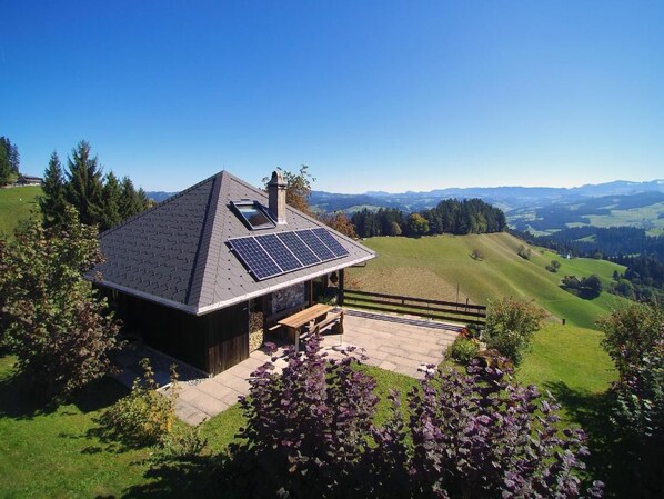 The outdoor area of the holiday home is characterised by its spectacular location at around 950 metres above sea level. Here you can enjoy the peaceful atmosphere and the impressive view to the full. The balcony or terrace are the perfect place to unwind and admire the unique landscape.