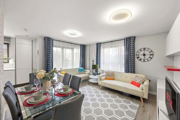 Spacious living/dining area with comfortable sofas and extra-large TV for relaxation after a busy day.