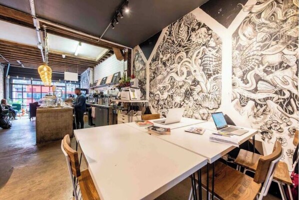 In the heart of Dalston, this bright studio offers a unique retreat with access to a coworking space and cafe on the ground floor. Meet like-minded individuals and get work done in a productive environment, then unwind in your fully furnished apartment with kitchenette, sofa, and double bed.