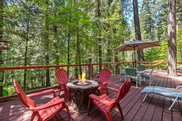 Step out onto a fully enclosed deck, perfect for kids and pets to play safely. Enjoy seating and lounging for 8, a propane fire pit, BBQ with side burner, and a cornhole game. Relax in the oversized hammock while soaking in the private forest views—your own outdoor retreat.