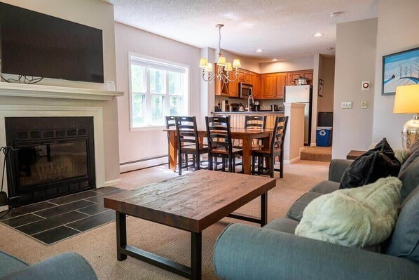 The main living space is super cozy with an efficient kitchen, a lovely dining area, and a large living room with a wood-burning fireplace. The kitchen is small but mighty with all new appliances, lots of storage, and a breakfast bar with seating for three. The dining table has seating for six with a view of the slopes in the distance through the large window. Entering the living space, there's lots of comfortable seating with two couches and a large coffee table ready for board games or a charcuterie board. The wood-burning fireplace is prepped for your nightly fires with a wall-mounted flatscreen television hanging above. The backdoor exit to the trails can be accessed through the living room as well with a small patio too.