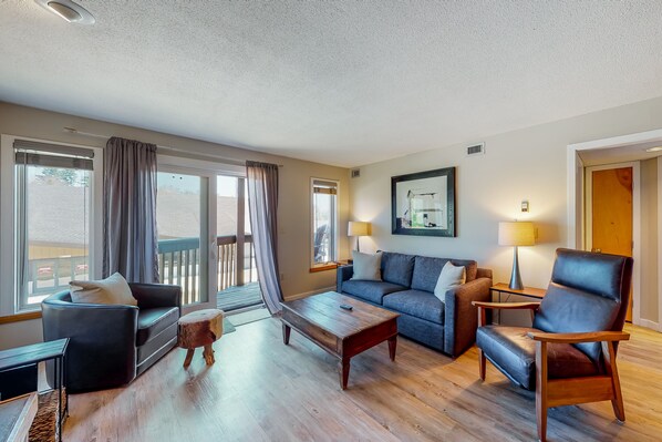 Inside you'll find a bright interior with plenty of natural light pouring through the windows purposefully built for admiring the fantastic view. With lots of soft furniture, enjoy sitting comfortably and carrying on a great conversation or watching a movie on the TV. Hobby chefs will love preparing meals or on-the-go snacks in the full kitchen, equipped with stainless steel appliances and a breakfast bar that seats four. Get wonderful nights of rest in the soft bed in the main bedroom, which has a TV and a bathroom right next to it, boasting a roomy shower for washing off the sunscreen. Enjoy watching skiers come and go or admire the sunrise on the private patio with your calming morning coffee.