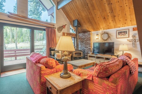 You can enjoy the fully equipped kitchen, dining area, and living room with a wood burning stove and flat screen TV with Cable, DVR and DVD. This unit is Pet Friendly. No washer or dryer.