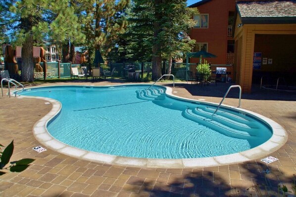 Step out to your private covered balcony for morning coffee or fresh mountain air. The complex features a beautiful seasonal swimming pool surrounded by park-like grounds, perfect for a refreshing swim on warm summer days. Unwind in the soothing spa or rejuvenating sauna. The communal picnic and BBQ area is available seasonally, offering grills and outdoor seating among the pines for relaxed meals. A free ski shuttle stops right outside, and heated underground parking keeps your vehicle snow-free during winter months.