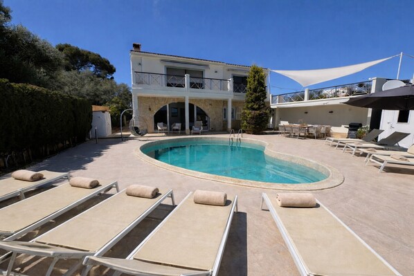 The outdoor area is a real highlight: several covered terraces with lounge furniture and large dining tables, additional lounge areas on the lawn, sun loungers, parasols, and a padded swing invite you to relax. The 48 m² curved private pool and a gas barbecue complete the perfect holiday experience.