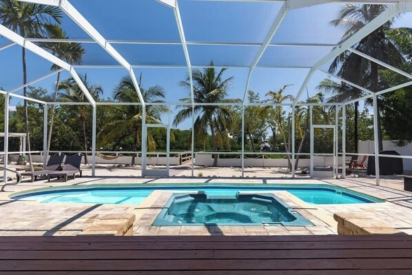 Guests have access to the entire property, privately screened-in pool, private dockage and parking.