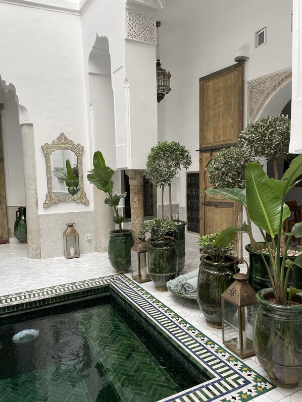 A royal retreat in the heart of Marrakech with mountain views, where travelers can relax in a heated plunge pool or explore nearby Souks