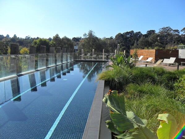 Heated (27 degrees) 25m lap pool with Yarra River views and sun deck with loungers and spa