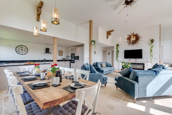 This chic two-storey property boasts plenty of natural light and is furnished with art pieces bringing a vibrant energy. The ground floor is a spacious open-plan area where you can lounge on plenty of comfortable seating while chatting or watching the Smart TV. The contemporary kitchen has everything you need to cook up a storm and enjoy memorable meals around the dining table. One super-king-size bedroom with an en-suite bathroom and a second with an en-suite shower room complete the downstairs features. Up on the first floor are three super-king-size bedrooms, each with a Smart TV and an en-suite bathroom. The outside area is an extension of the inviting inside space with a decked area to relax on, as well as a garden and BBQ. There are shared outdoor and indoor areas for games available.