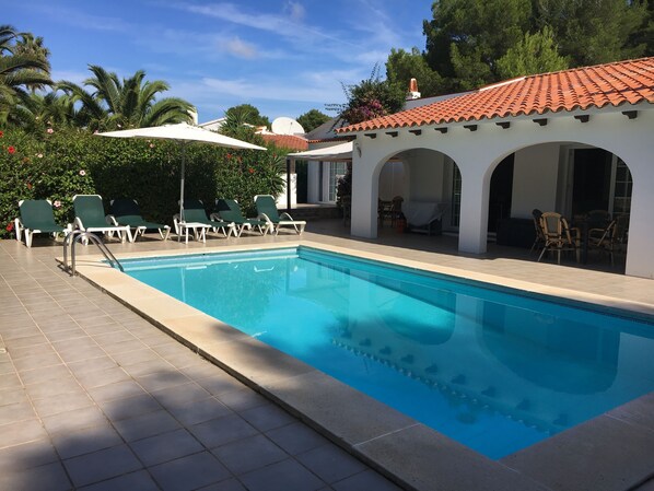 A first double bedroom has its own bathroom and allows direct access to the swimming pool via a French window opening onto the terrace.