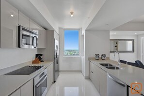 Waterfront apartment with kitchen and balcony