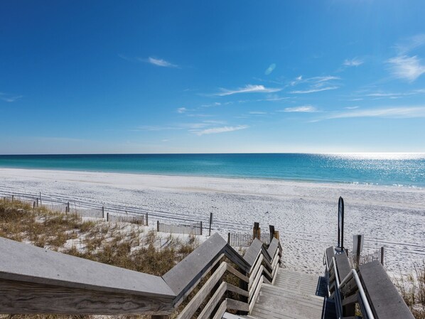 A Stone's Throw, a charming vacation rental in Destin, features hand-scraped wood floors and soothing sky-blue walls. Relax on the pool deck or unwind by the fireplace with a movie night in the chef-ready kitchen and dining area that seats eight.