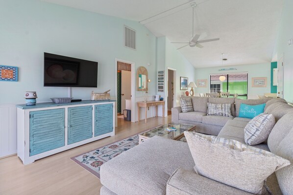 Step into a light-filled coastal living room designed for comfort and connection. Vaulted ceilings, large windows, and soft pastel tones create a serene beach-inspired vibe, while plush, light-colored sofas offer the perfect spot to unwind. Enjoy your favorite shows on the flat-screen TV with cable, stay connected with high-speed Wi-Fi, or gather for a fun night of board games with friends or family. Open the front door to let in the ocean breeze—you can even catch a glimpse of the sea!