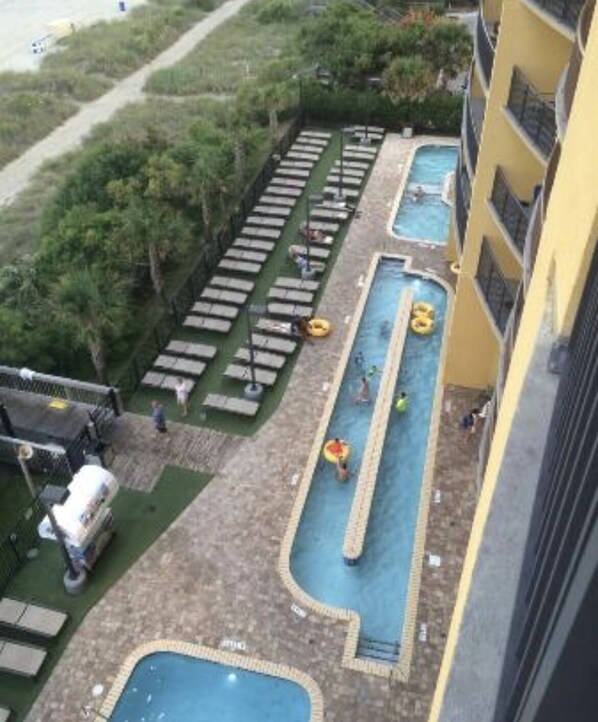 Ocean front view, balcony, lazy river, Hilton grand vacations property, free mini golf across the street plus other area freebies. Restaurant discounts. 1 king bed, 2. Beds in 2nd bedroom may be queen or full, pullout sofa in living room