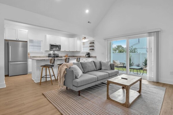Step inside to soaring vaulted ceilings, abundant natural light, and a sleek open-concept design that invites connection and relaxation. The living area features cozy, modern seating and flows seamlessly into a fully equipped kitchen with stainless steel appliances, stone countertops, and a spacious dining table—perfect for shared meals and easy mornings.