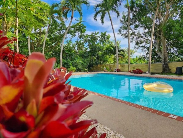 Patio with big pool, BBQ, seating areas, outdoor shower, and half bathroom.