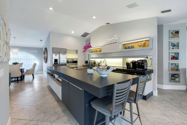 Fully stocked Poggenpohl kitchen with two full-size refrigerators
