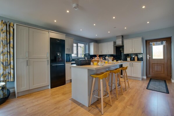 - Electric double oven and ceramic hob, larder fridge, microwave, dishwasher, slow cooker and cafetiere