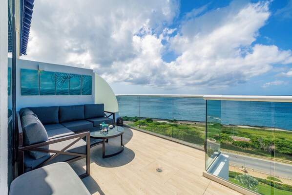 This 3-Bedroom Penthouse at The Turquoise Building of Blue Residences is located on the top floor (8th floor) with an amazing ocean view from every angle of the terrace. Modern Furniture, relaxing colors, this beach apartment will make your family vacation or reunion memorable. From this two-level condo you will enjoy spectacular 180-degree views of the Caribbean. The upper level features a fully equipped kitchen and a Living/Dining room area, a full bathroom, and a beautiful terrace.
