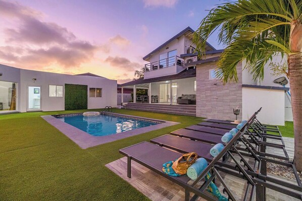 Enjoy the beauty of the outdoors without leaving the property by stepping out in the backyard for a magical Aruba evening. Here you'll discover multiple lounge areas and a luxurious swimming pool as the centerpiece of the villa.