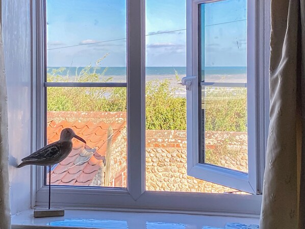 Bedroom 2: 2 x Single (3ft) Beds. Gas central heating, electricity, bed linen, towels and Wi-Fi included. Initial fuel for open fire included. Cot and highchair. Doggy extras. Enclosed lawned garden with patio and garden furniture. Bike store. Private parking for 1 car. No smoking.. Just a stone’s throw from the sandy beach, this traditional flint and pebble terraced cottage is situated in the coastal village of Bacton. It offers sea views from the double bedroom and is an ideal holiday accommodation for any time of year. The traditional seaside resorts of Cromer and Sheringham are 12 miles away and Wroxham, the capital of the Broads is just 10 miles. BeWILDerwood the outdoor adventure park at Horning makes a great day out for the children. Nearby Bacton Woods are ideal for cycling, walking and woodland picnics. Bird watching, golf and fishing all available locally. Shop and restaurant 400 yards, pub ½ mile.