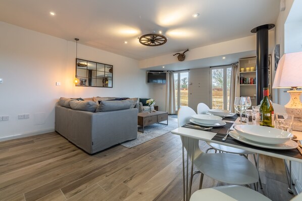Refurbished with the utmost attention to detail, Wheelwrights has underfloor heating throughout, ceramic flooring to the ground floor, a digitally programmed rainfall shower and three Bluetooth speaker systems enabling you to play your favourite music wherever you are! The well-planned dual aspect ground floor living area comprises a sitting and dining area where there is a wood burning stove to light and keep you warm on cooler days, and a compact, user-friendly kitchen. Off the living area is a smart bathroom and a staircase with rope handle and pretty LED lights illuminating the stairs leading you to the first floor. Upstairs you will find a stunning master bedroom with a vaulted ceiling, king-size bed with a brick and flint backdrop and a window view across the fields. The second bedroom houses a single bed, that can be converted to a king-size bed if you prefer, for a small additional charge (please request on booking).