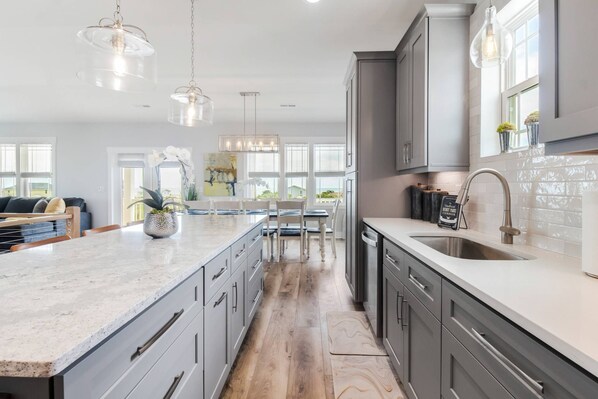 On the 3rd level is a large living area with a big-screen Smart TV, games & books for beach reads. The dining table seats 10 & the island seats 6. This is a chef’s kitchen: 4 door French Door Refrigerator, large Workstation Sink, abundant dish & food Storage, Air Fryer, Hand Mixer, Keurig & Drip Coffeemakers & a large island for plenty of Prep Space. There’s even a Publix grocery store across the street in case you forgot something while making dinner.