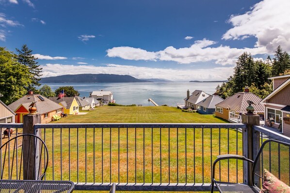 The house itself is two story entering on the upper floor where you will find a good-size living room, dining room and kitchen area combined across its entire water view side. This area also opens onto a view deck with new propane BBQ and outside chairs and table. This is the perfect warm summer vantage point to watch the sunset on Lummi and Cypress Islands across Rosario Strait. The living room has a fireplace new Smart HDTV for your pleasure, including satellite television.