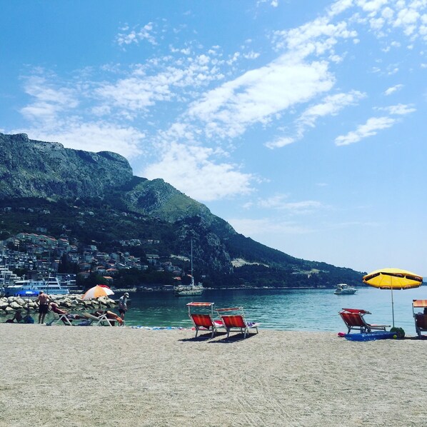 The town's ancient history, the bay's crystal clear waters, the river Cetina's perfect rafting waters, the shallow sand beaches for families with young children, and you have the perfect Croatian Summer Beach House for all. Amenities: AC, heat, Wi-Fi, 3 double bedrooms, 1 triple bedroom & 1 double sofa bed; each bedroom has ample closet space and a small sitting area; ground floor has full kitchen with all amenities and a breakfast nook on the first floor suite. .