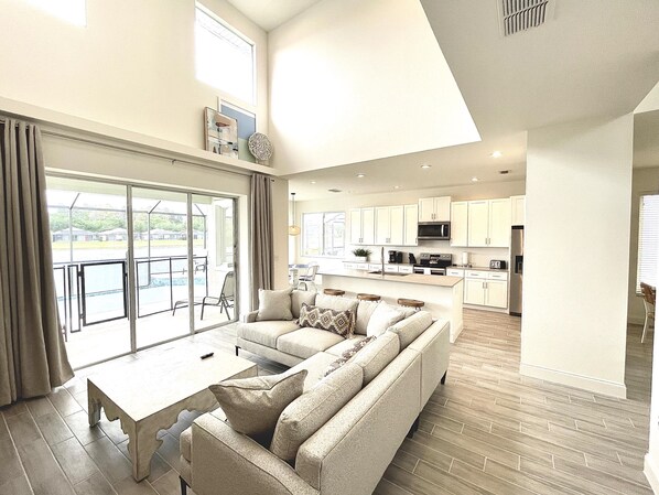 The Mickey's Lake House is a completely updated and locally managed 2604 square foot 5 bedroom / 3.5 bathroom waterfront vacation villa that sleeps 10. Pull into your private driveway and walk through the front door into a spacious, open-concept home with modern, comfortable, and professional decorating. As you pass the first of two living spaces and the formal dining room, you enter the lakefront side of the home. You won't believe it as you enter the open-concept great room with 20-foot ceilings. Relax in this well-appointed room as the furniture is perfectly positioned to catch your favorite shows on the 65" smart TV or enjoy the lake views through the 12-foot wall of glass.