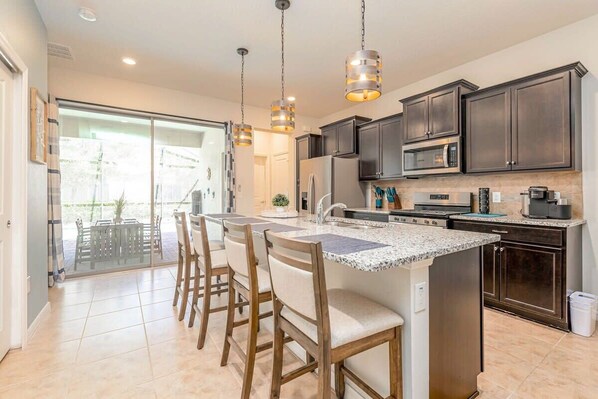 This vacation wouldn’t be complete without a private pool located in the screened-in lanai, providing a perfect space to relax and enjoy the Florida sunshine. The area includes sun loungers for sunbathing and an outdoor dining table for al fresco meals. A child safety fence ensures peace of mind around the pool, and the covered section of the lanai offers a comfortable shaded area for those who prefer to stay out of the sun.