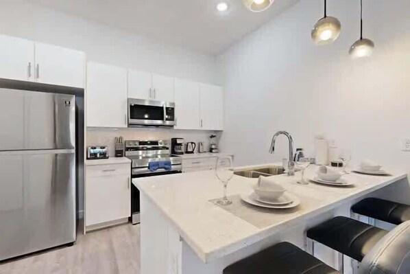 ➜ The kitchen is fully equipped with appliances including a fridge and a stove.